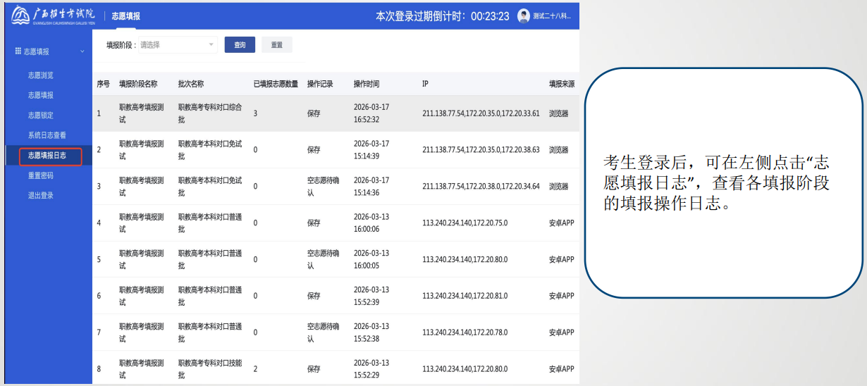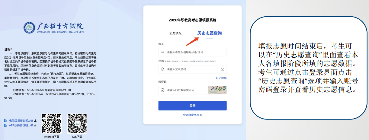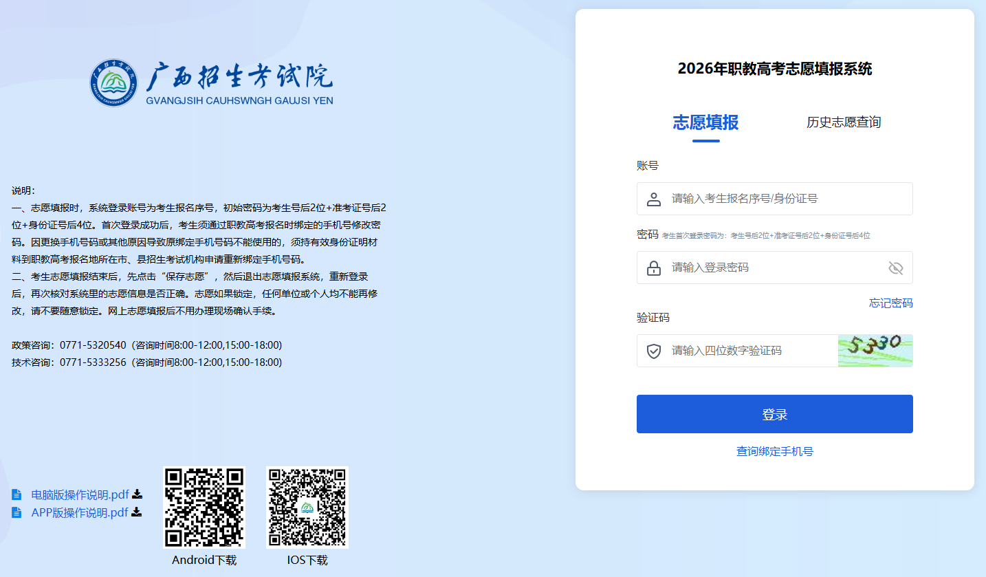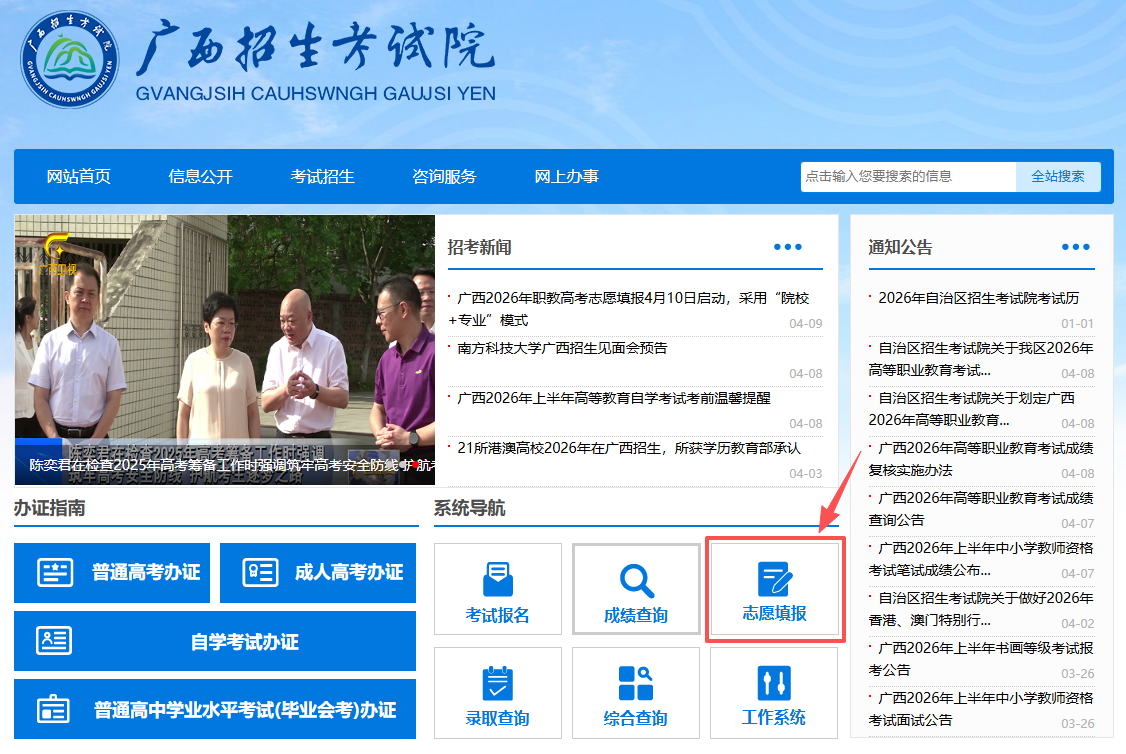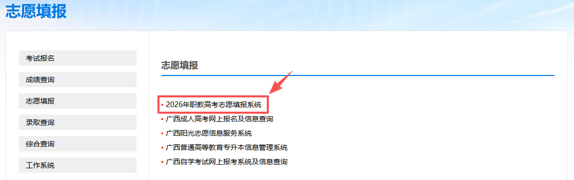 (1)通过电脑端填报的考生,须在志愿填报规定时间内登录“广西招生考试院”网站(填报志愿的唯一网站),点击“志愿填报”栏目,在“2026年职教高考志愿填报系统”(以下简称志愿填报系统)中进行填报。