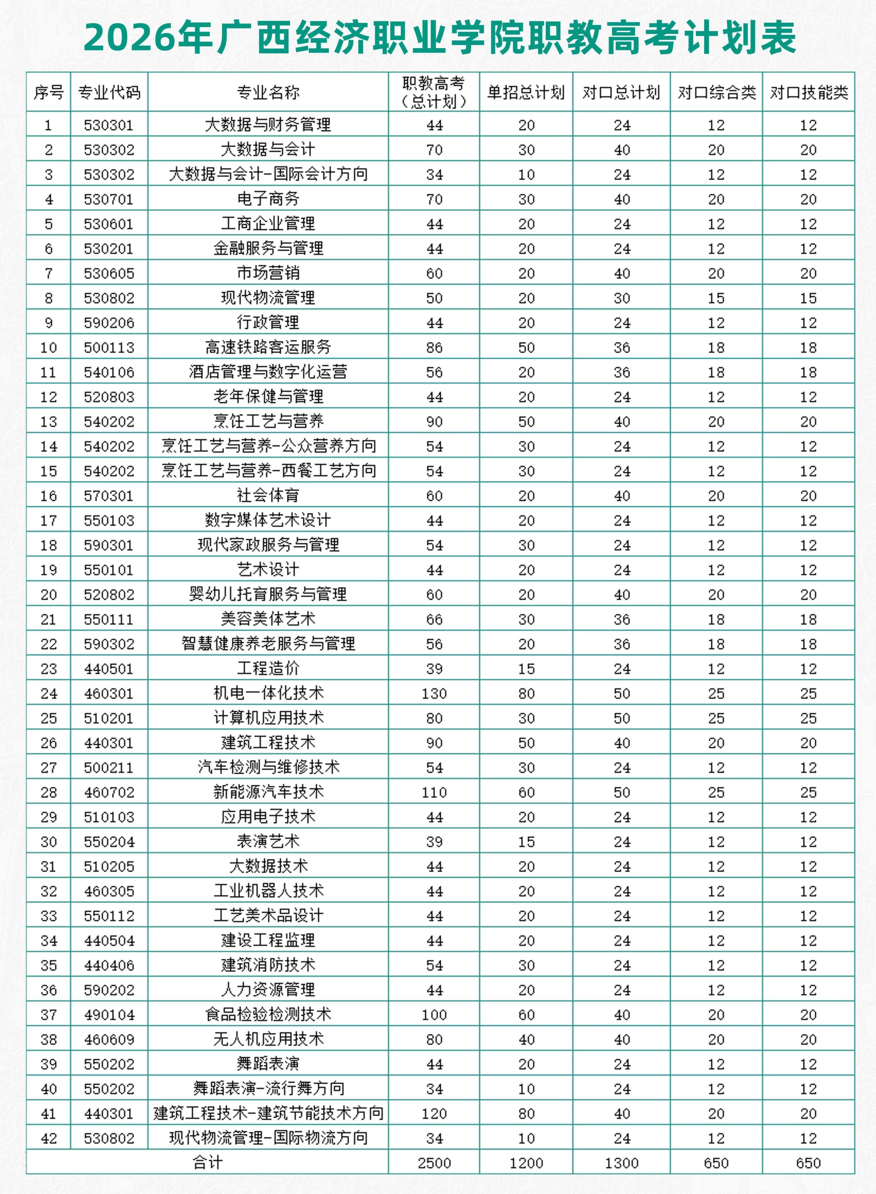 2026年学校单招对口阶段共有42个招生专业,单招总计划1200个,对口总计划1300个,详细招生专业及计划数请查看下表