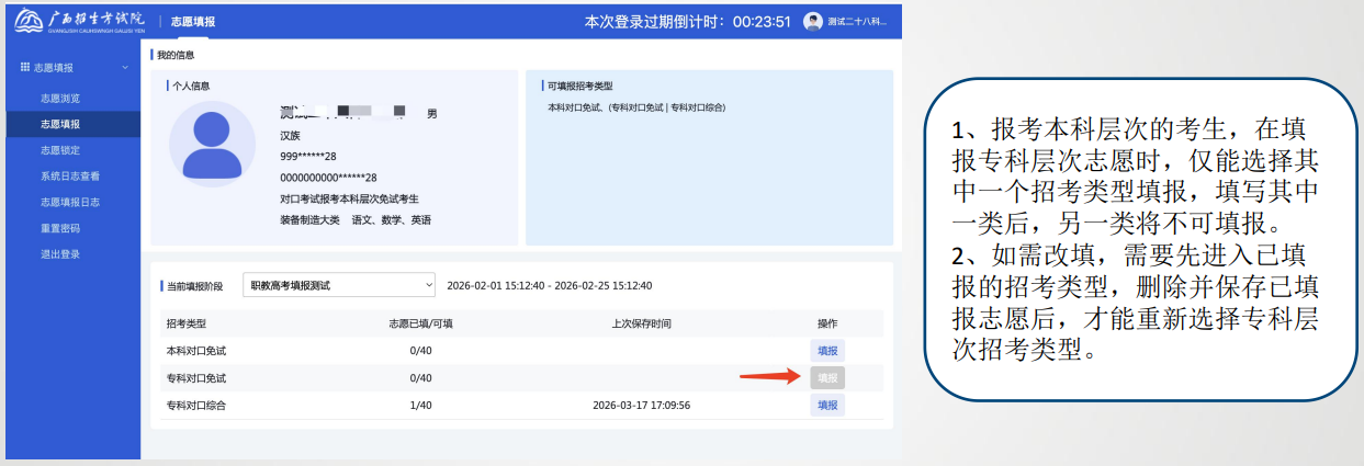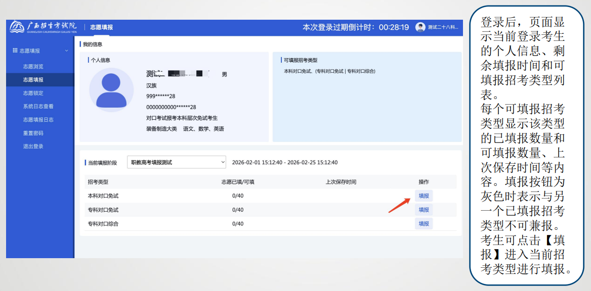 考生登录后,页面显示当前登录考生的个人信息、剩余填报时间和可填报招考类型列表,考生可根据报名时的类型点击【填报】进入当前招考类型进行填报。