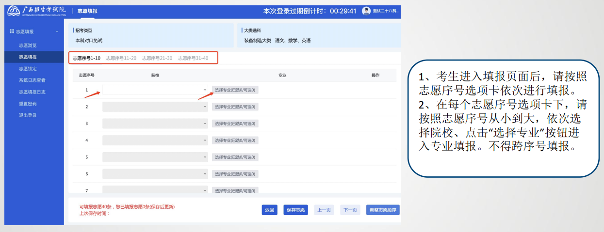 考生填报志愿时,每次登录系统后的有效操作时间为30分钟。因此,建议考生先将有关志愿信息(院校代号、院校名称、专业组、专业代号、专业名称等)在草稿上整理好,登录系统后按整理好的内容进行选择即可。