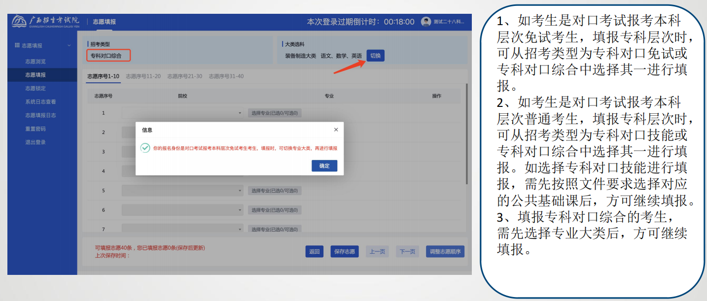 登录成功后,点击系统界面左上方的“志愿填报”按钮,进入志愿填写页面。