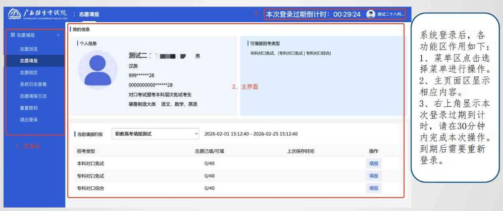 登录成功后,志愿填报系统首页会显示考生个人信息,包括姓名、准考证号、身份证号、民族、性别等,考生应仔细核对,如发现信息有误,应及时向高考报名所在地招生考试机构报告。