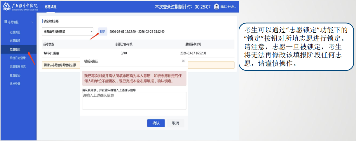 如考生在确定自己的志愿信息后(建议先退出志愿填报系统,重新登录再次核对志愿信息),为防止他人篡改,可点击“志愿锁定”并输入锁定确认信息,对当轮次所能填报的所有批次的志愿进行一次性确认并锁定。
