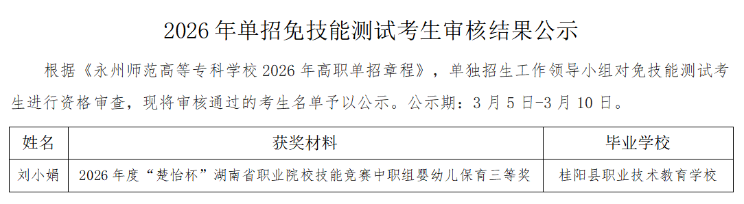 2026年单招免技能测试考生审核结果公示