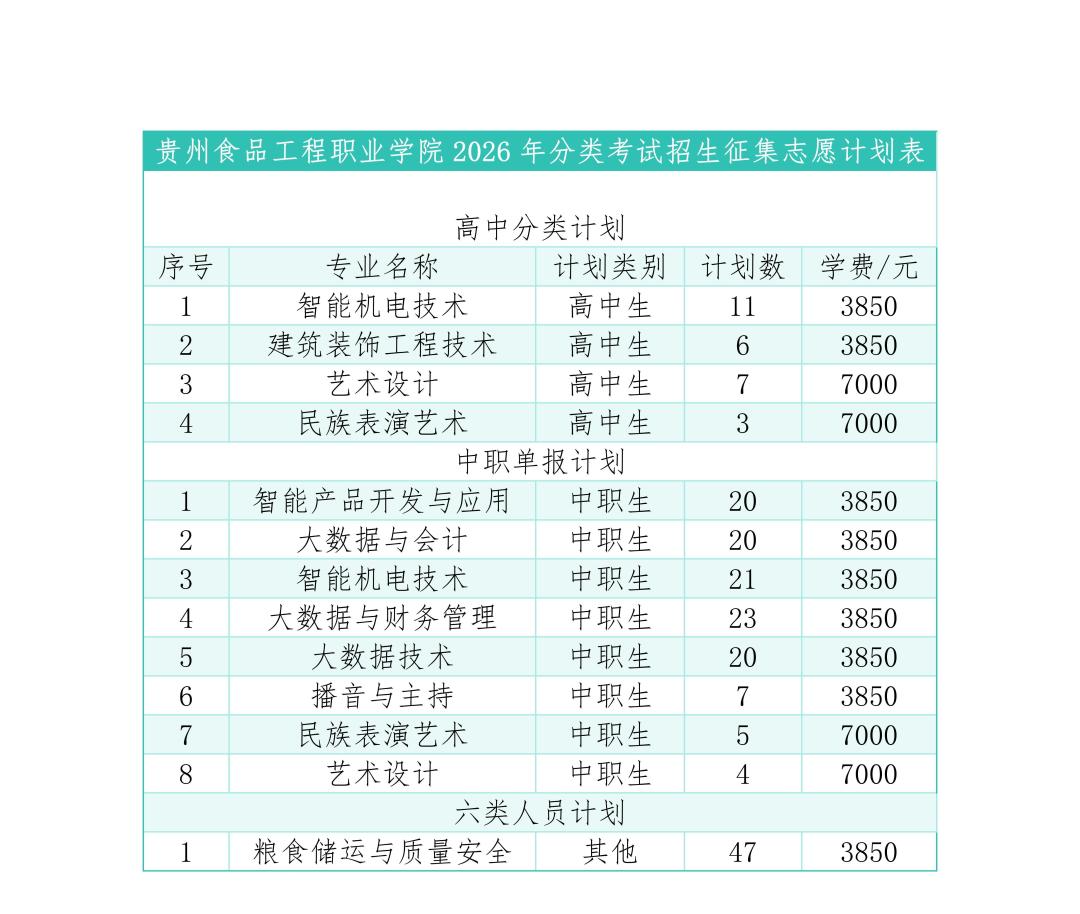 根据贵州省招生考试院分类考试招生工作安排,贵州食品工程职业学院2026年分类招生考试,第一轮录取已圆满结束,目前尚有部分专业缺额,现面向符合条件的考生公开征集志愿,具体事项如下: