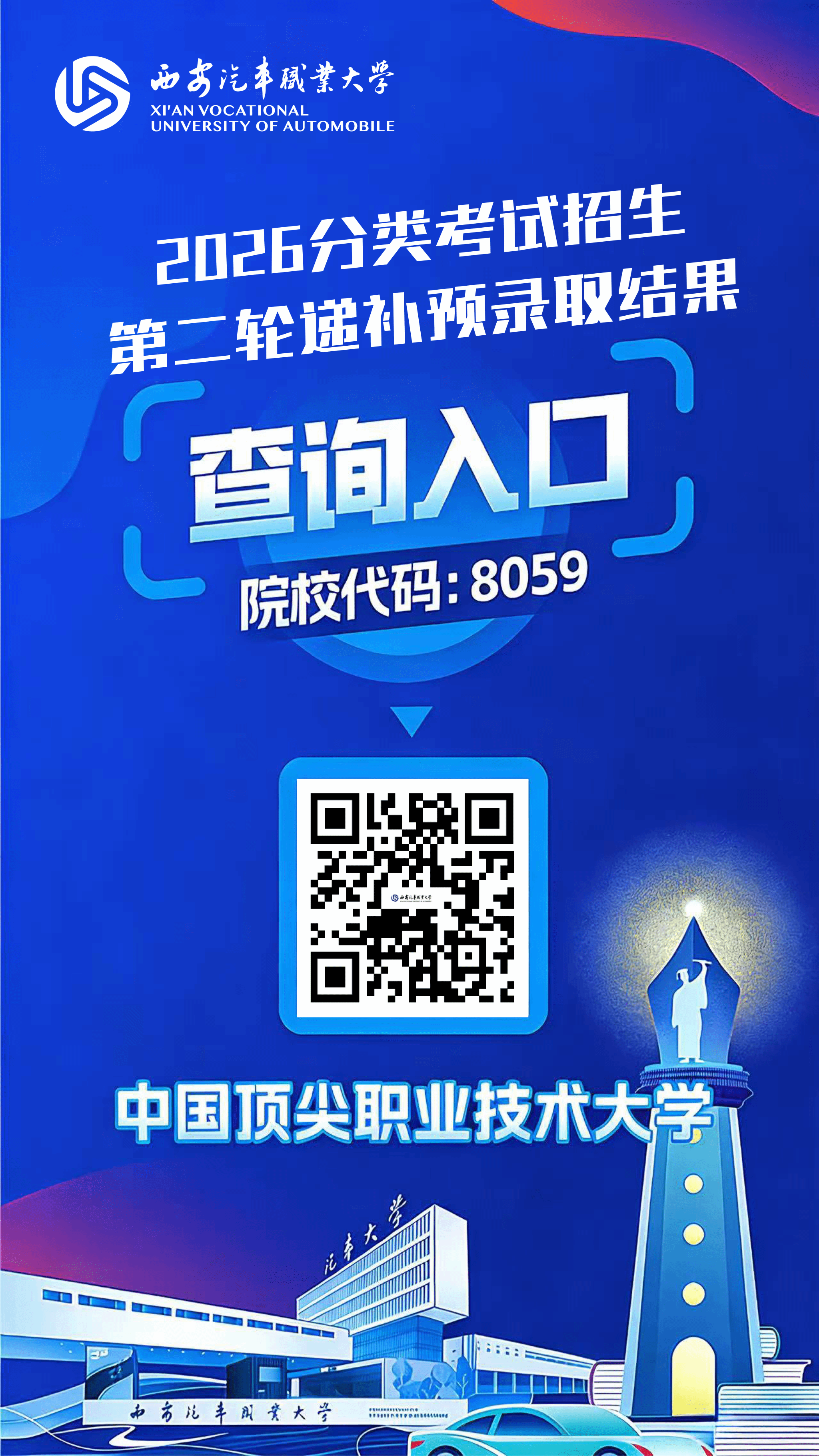 登录西安汽车职业大学官网 https://www.xvua.edu.cn/或我校招生信息网https://zhaosheng.xvua.edu.cn/点击浮窗进入我校分类考试招生报名系统:https://qcpc.sxlzsoft.com/flks/login,输入考生本人身份证号及密码,登录查询第二轮递补预录取结果。