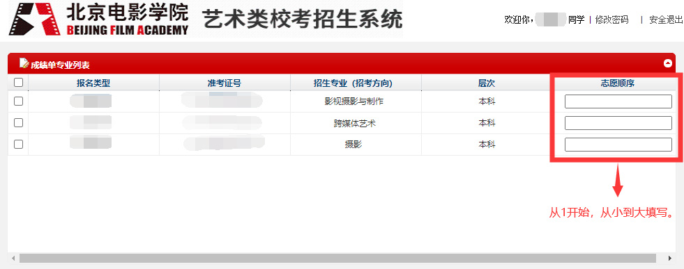考生若多个专业(招考方向)的终试通过,请于2026年4月30日中午12:00前,在【招生系统】中填写终试通过的专业志愿顺序。填写方法:在如下图所示的红色方框标注区域内,填写1至3的数字,用来表示专业志愿顺序,专业志愿顺序输入后即可保存。