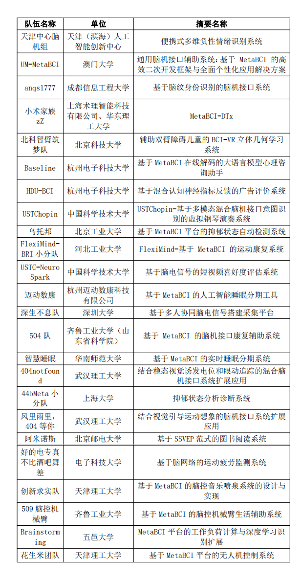 感谢各参赛队伍对大赛技术赛“MetaBCI创新应用开发赛项”的支持!截止7月5日,该赛项预赛已经结束,通过对各赛队报名资料的专家联合评审并汇总结果后,现已确定入围赛队名单。现将“MetaBCI创新应用开发赛项”入围赛队名单公示如下: