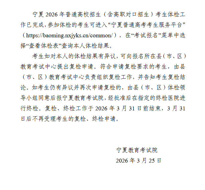 宁夏:关于2026年普通高校招生考生体检结果查询的通告