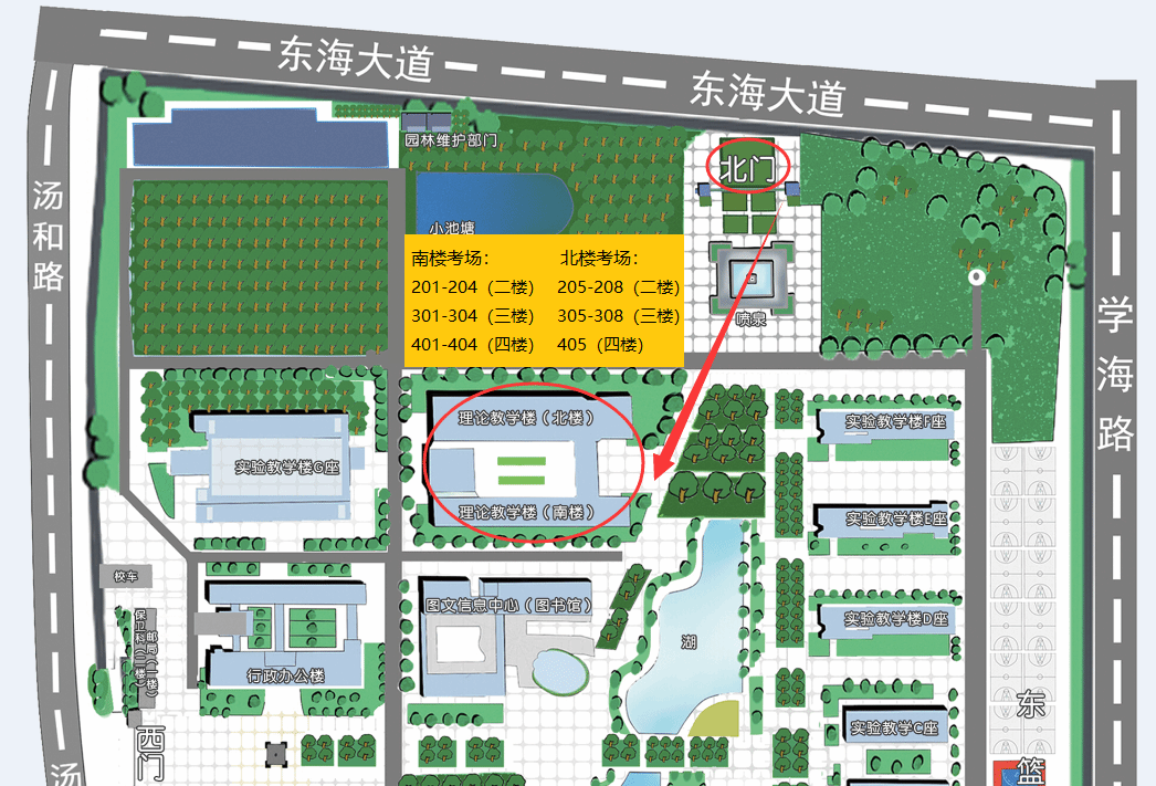 3.请考生务必提前认真仔细查看准考证,确定考场位置、考场号和座位号。进校路线图及考场分布情况如下: