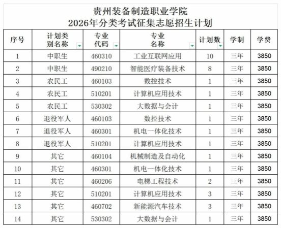 贵州装备制造职业学院2026年分类考试招生第一次录取后,学院中职类、专项类招生计划尚有部分缺额,考生可根据缺额情况进行征集志愿填报,志愿填报代码:0763
