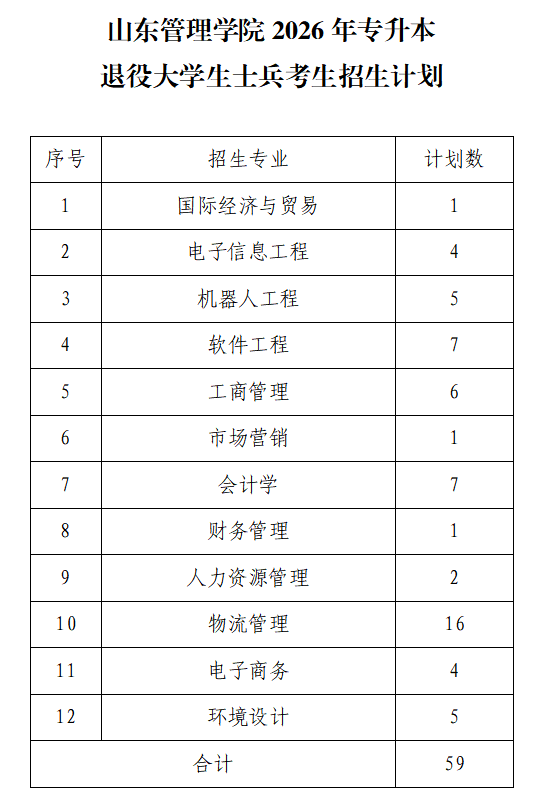 山东管理学院2026年专升本退役大学生士兵考生招生计划