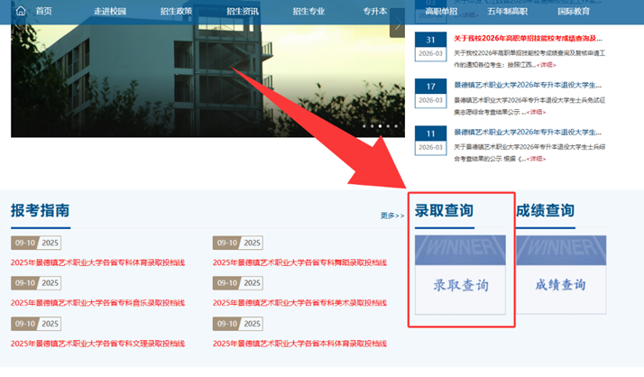 根据江西省教育厅《关于做好全省2026年高等职业教育单独招生考试工作的通知》(赣教考字〔2025〕24号)及《景德镇艺术职业大学2026年高职单独招生简章》有关规定,现将我校2026高职单招拟录取结果查询及相关事项通知如下。