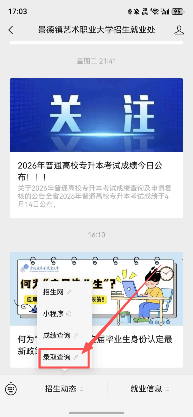 2.公众号查询。关注“景德镇艺术职业大学招生就业处”官方微信公众号,在菜单栏找到【录取查询】,进入录取查询页面后,凭高考考生号查询拟录取结果。