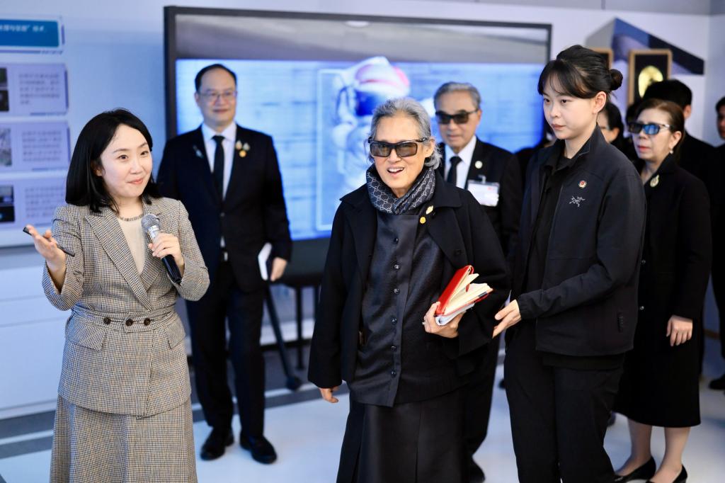 在科技成果展厅,诗琳通公主提笔写下“智创未来”寄语学校,表达对以智能技术赋能中泰合作、共筑美好未来的殷切期许。