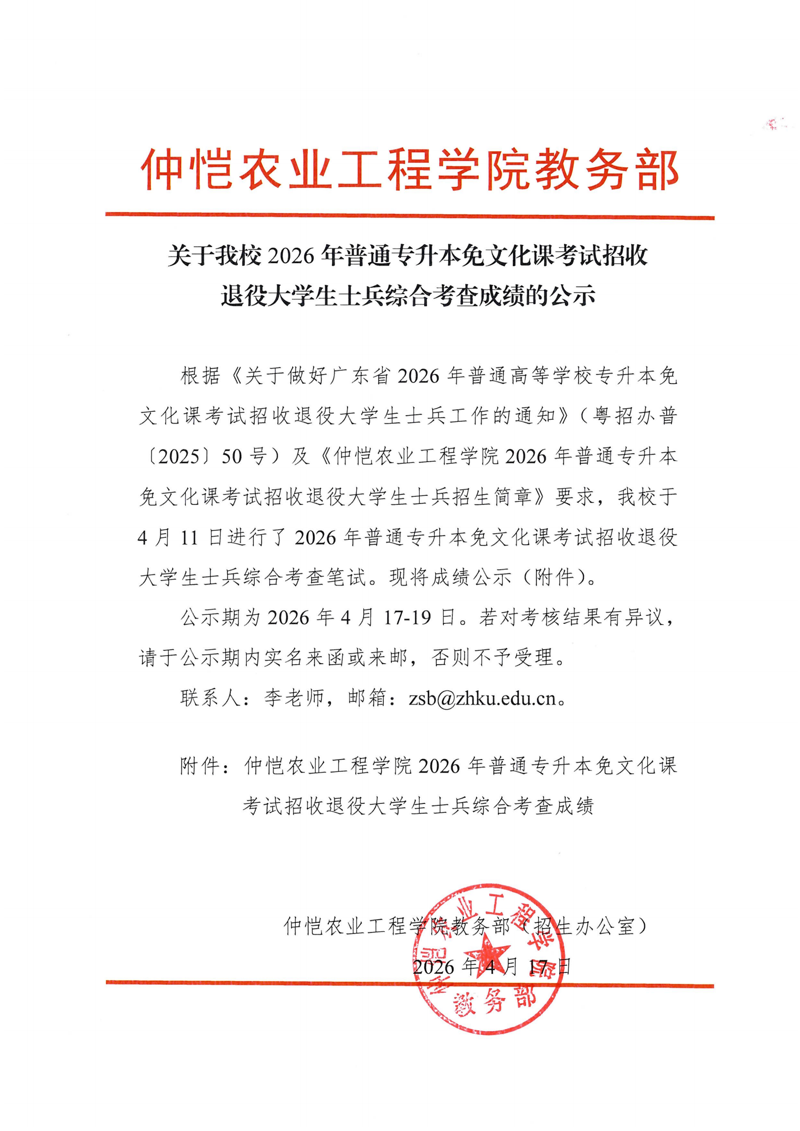 关于我校2026年普通专升本免文化课考试招收退役大学生士兵综合考查成绩的公示
