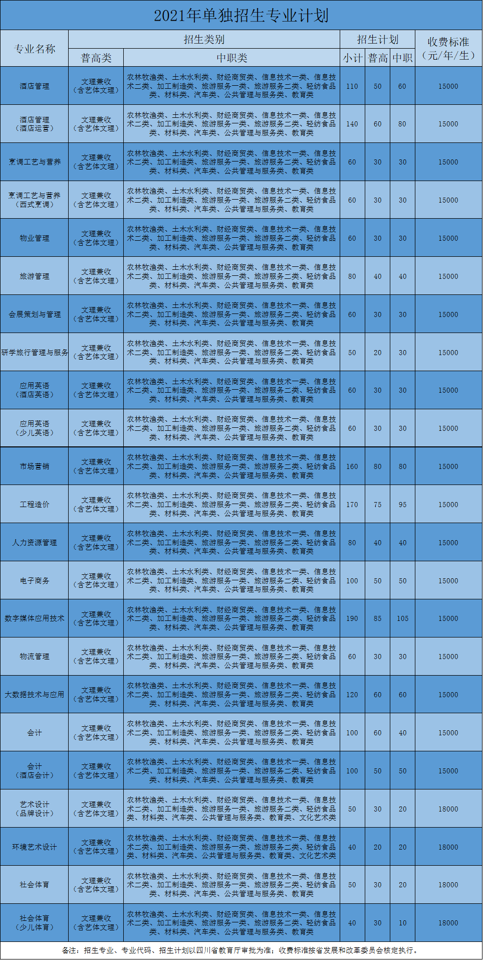 成都银杏酒店管理学院2021年单独招生专业及招生计划表