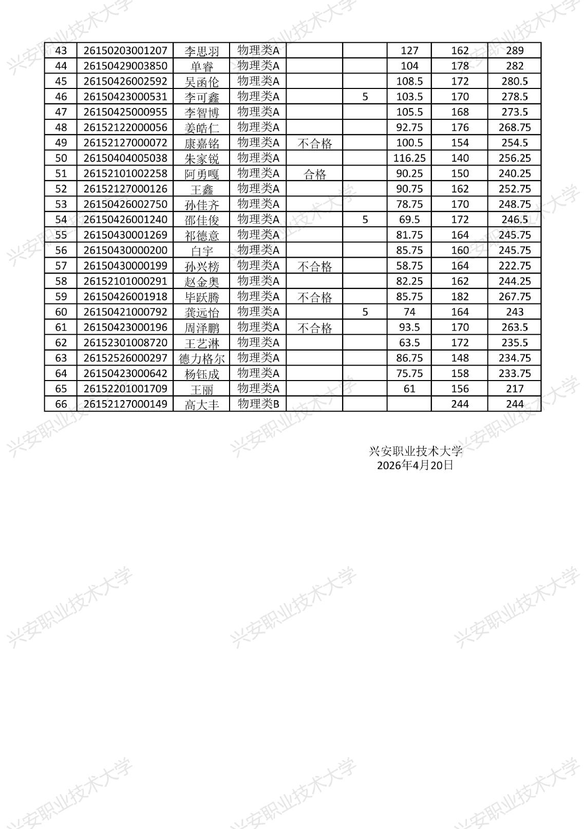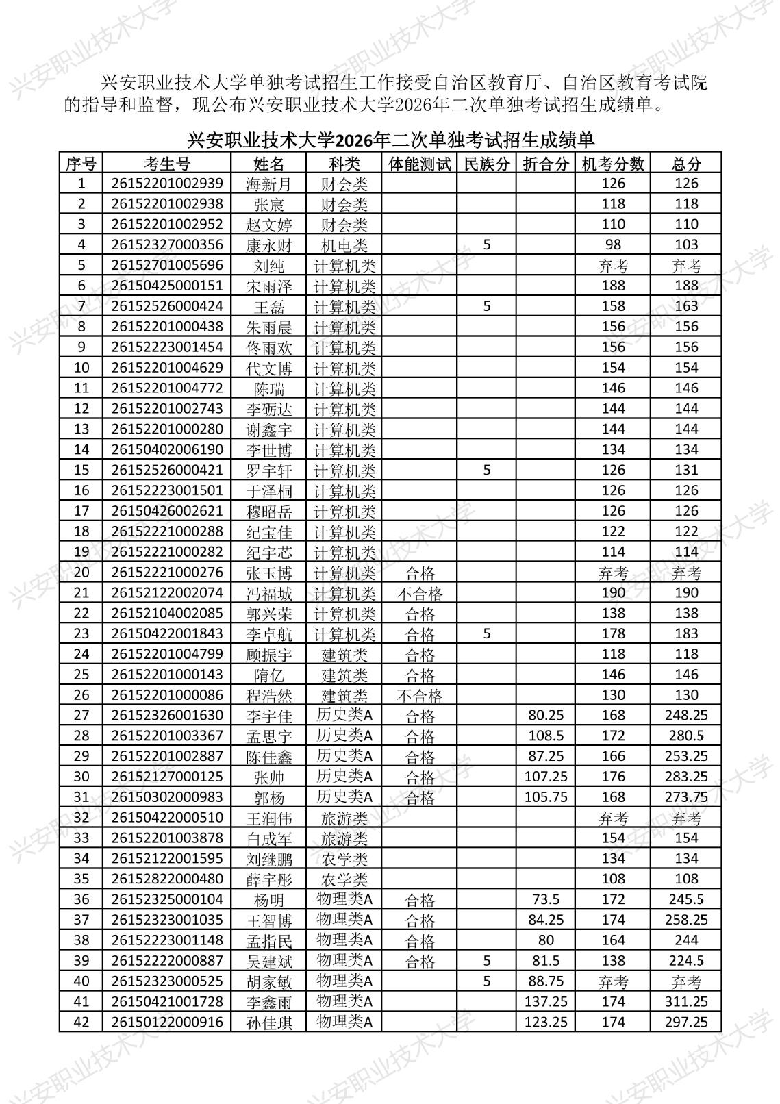 兴安职业技术大学2026年二次单独考试招生成绩单