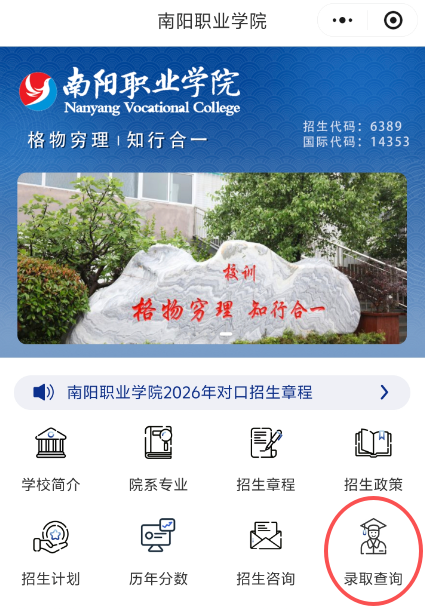 方法三:关注南阳职业学院招生办微信公众号,点击右下角“录取查询”栏目中的“高招录取查询”跳转至录取结果查询页面进行查询。方法四:关注南阳职业学院招生办微信小程序,点击页面“录取查询”栏目跳转至录取结果查询页面进行查询。