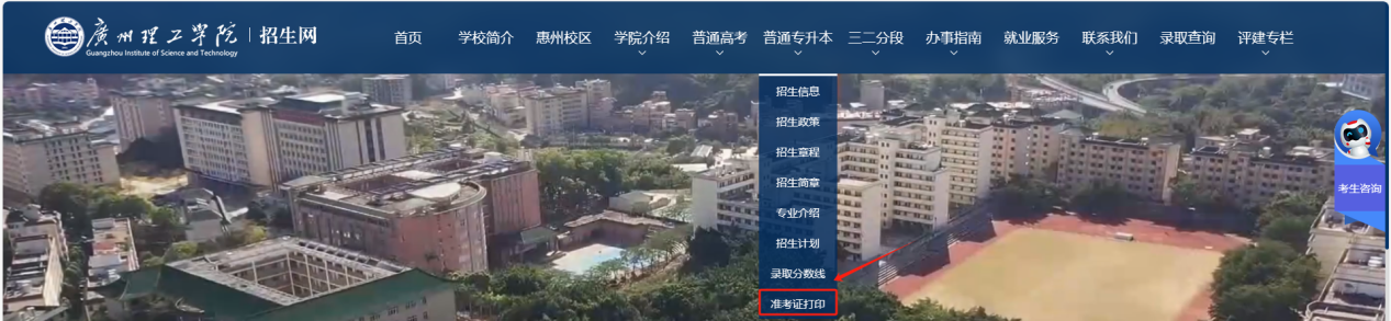 第一步,进入广州理工学院招生网(链接:https://zsb.gzist.edu.cn/),打开栏目“普通专升本”,点击“准考证打印”进入查询页面。
