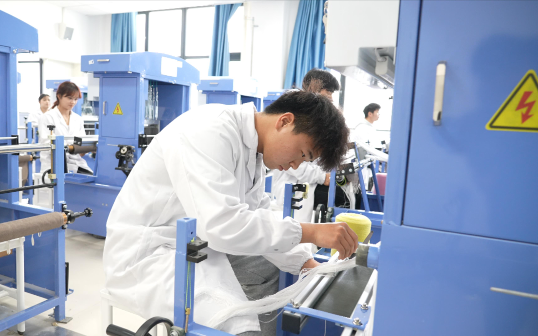 ▲纺织工程学院进行半自动小样织布机实践教学