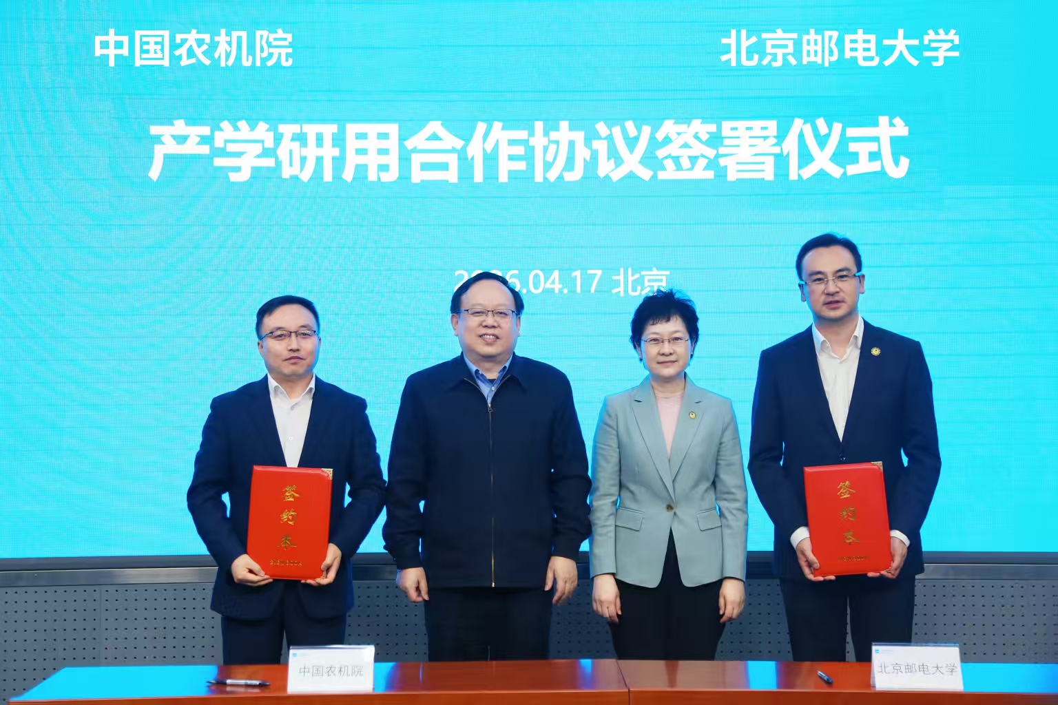 4月17日,北京邮电大学与中国农业机械化科学研究院集团有限公司(以下简称中国农机院)签署产学研用合作协议。中国农机院党委书记、董事长马敬春,党委副书记、总经理苑严伟,副总经理赵博、尚小龙,北京邮电大学党委书记续梅,副校长任雄飞出席签约仪式。