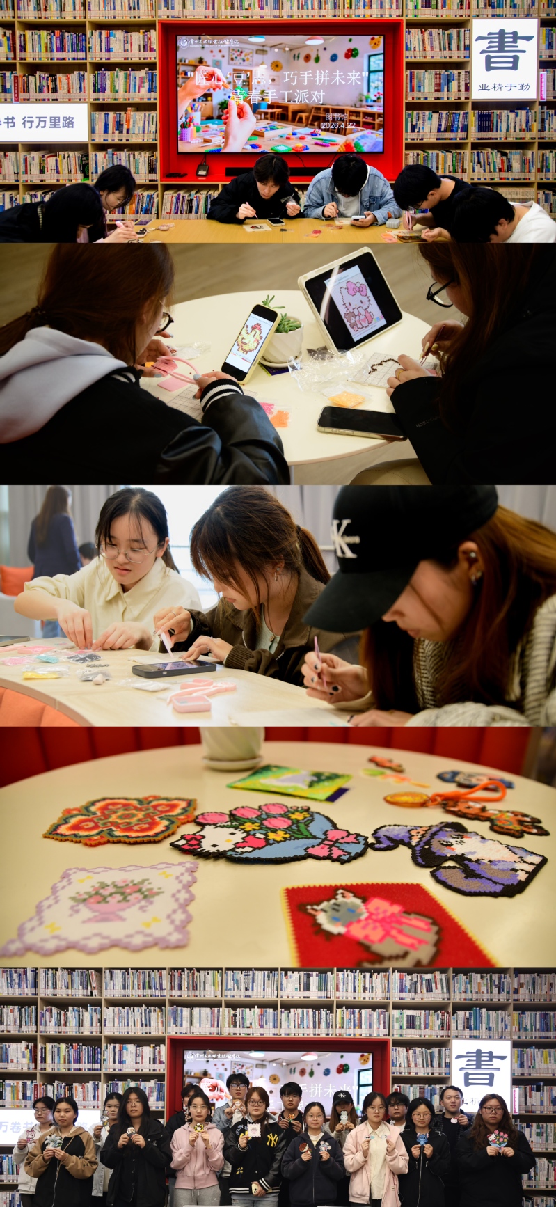 当日下午,“匠心‘豆’志,巧手拼未来”青春手工派对在图书馆举办。活动以当下流行的拼豆为载体,将手工创作与工匠精神培育相结合,引导青年学子在像素化创作中磨砺心性、沉淀自我。活动现场,同学们围坐在一起,手持镊子挑选彩豆、细致排列拼贴,用双手拼绘青春蓝图,实现了动手实践与文化浸润的有机结合。