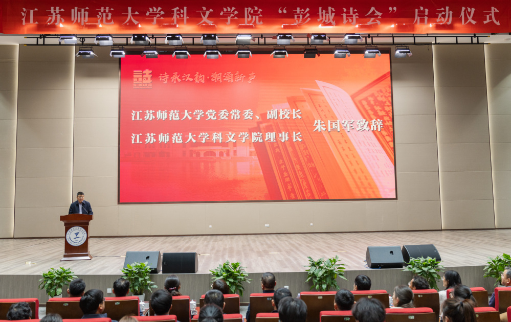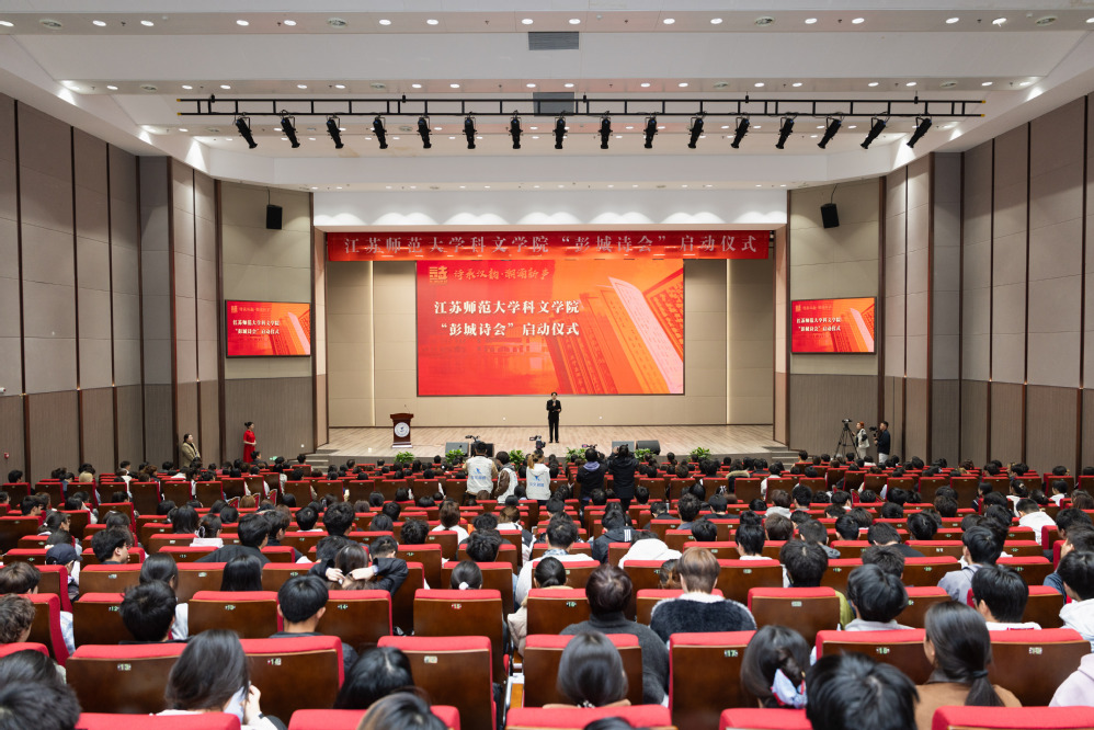 4月22日,“彭城诗会”启动仪式在学院图书馆明志报告厅隆重举行。中国语文现代化学会会长、中国传媒大学博士生导师姚喜双教授,江苏省朗诵协会副会长、徐州市朗诵艺术协会会长、徐州电视台著名主持人李传明,徐州市文化广电和旅游局二级调研员韩如海,徐州市委宣传部理论处处长李翠梅,徐州文化产业投资管理集团党支部书记、执行董事闵敏等校外嘉宾,江苏师范大学党委常委、副校长、科文学院理事长朱国军,学院全体院领导及师生代表500余人参加活动。