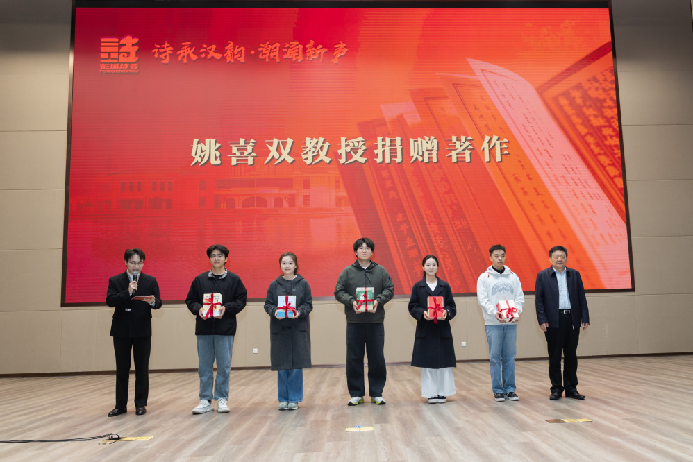 结合“全民阅读活动周”,姚教授向青年学子捐赠经典书籍,勉励广大学子多读书、读好书,自觉当好中华优秀传统文化的传承者与弘扬者。随后,他与师生代表共同合诵《七律・长征》。铿锵有力的诵读声回荡全场,字里行间饱含着对革命先辈的崇敬与缅怀,也迸发出新时代青年的蓬勃朝气,“彭城诗会”在经典吟咏中正式拉开序幕。
