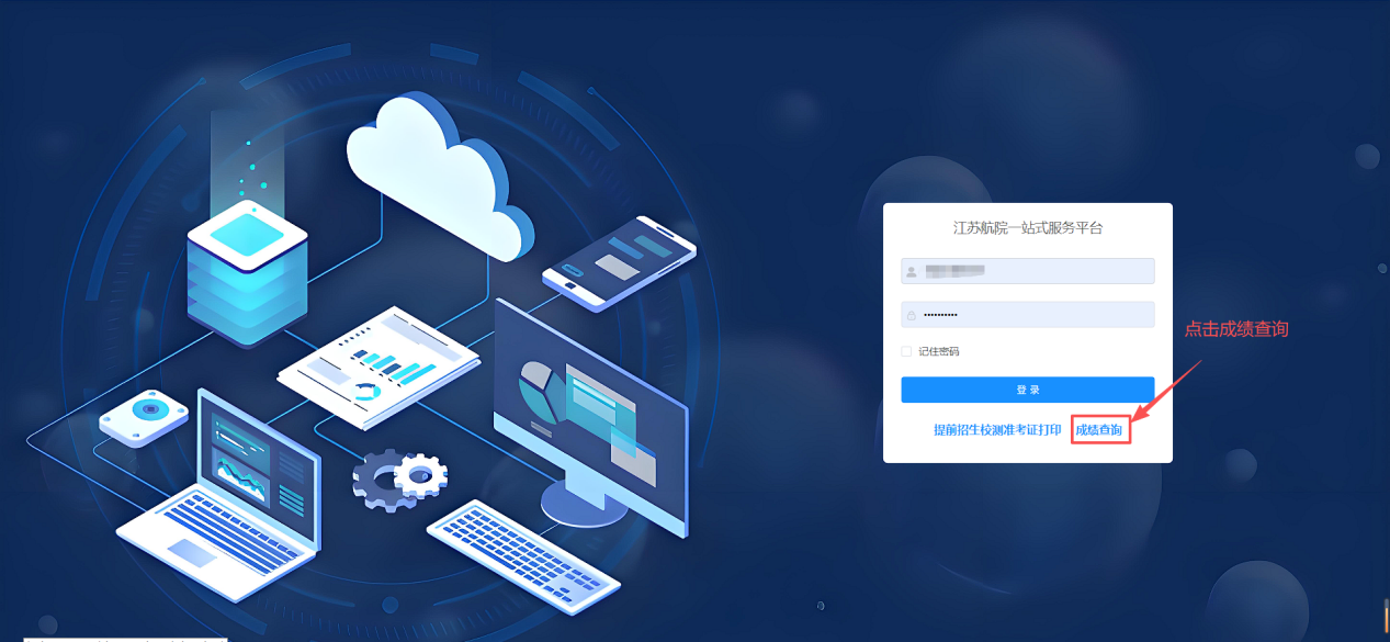 1.电脑端打开江苏航院一站式服务平台网站,单击成绩查询;