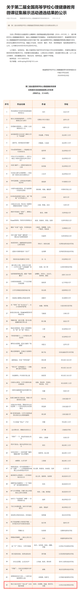 4月20日,由教育部思想政治工作司指导、普通高等学校学生心理健康教育专家指导委员会主办、中国大学生在线承办开展的第二届全国高等学校心理健康教育微课征集展示活动遴选结果正式公示,活动共征集到2806件作品,经初评、复评、终评、政审等程序,共有160件教师作品、80件学生作品入选。我校教师陈菲、冯国峰、张超、隋芳芳、吴翰的微课作品《修正人际关系中“读心术”认知偏差现象》成功入选,展现了我校教师在心理健康教育领域的专业素养与教学能力。