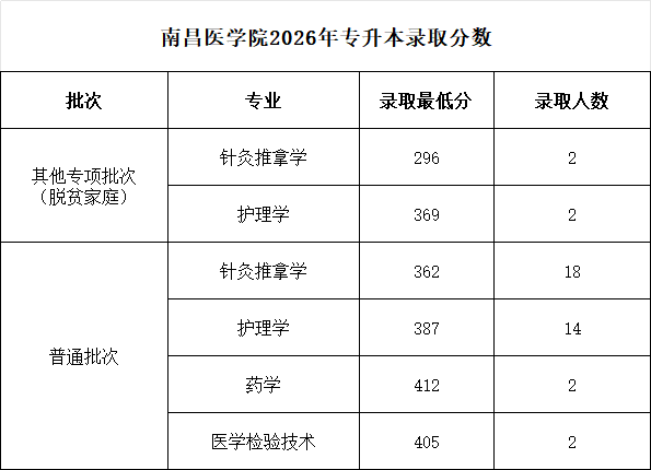 南昌医学院2026年专升本录取分数
