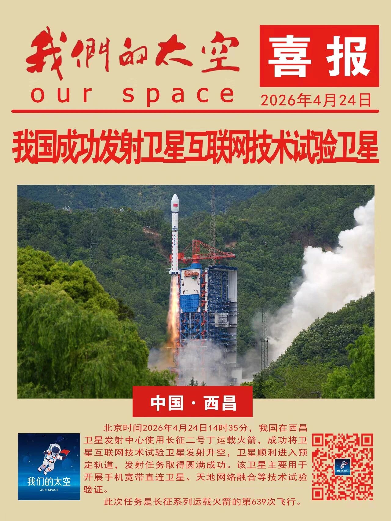 北京时间2026年4月24日14时35分,我国在西昌卫星发射中心使用长征二号丁运载火箭,通过一箭四星方式,成功将卫星互联网技术试验卫星发射升空,卫星顺利进入预定轨道,用于开展手机宽带直连卫星、天地网络融合等技术试验验证,发射任务获得圆满成功。