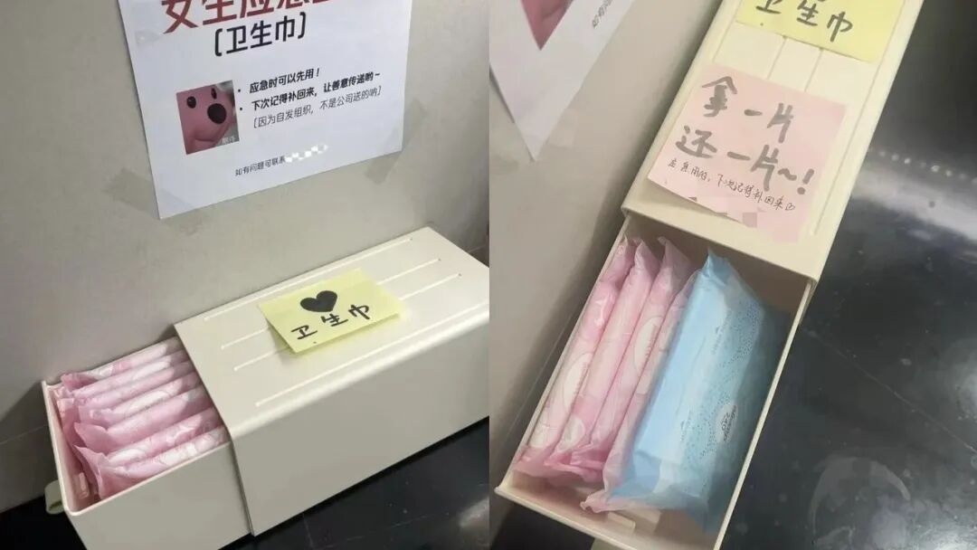 最开始是我们几个自费放卫生巾,后来同事们知道了,就开始自发捐钱(女生、男生都有)。慢慢地,这个卫生巾项目就一直做了下来,到现在已经两年多了。