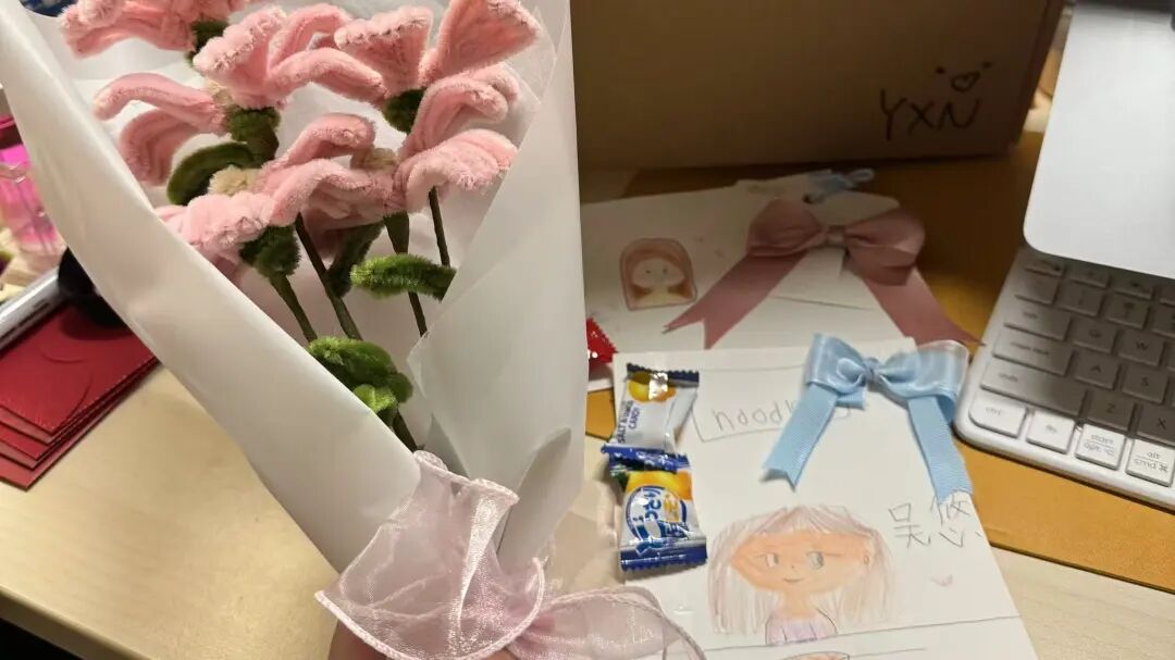 09出差回来第一天,以为没人会记得自己的生日,但发现桌上放满了发小们送的礼物,其中还有她的女儿亲手画的画。