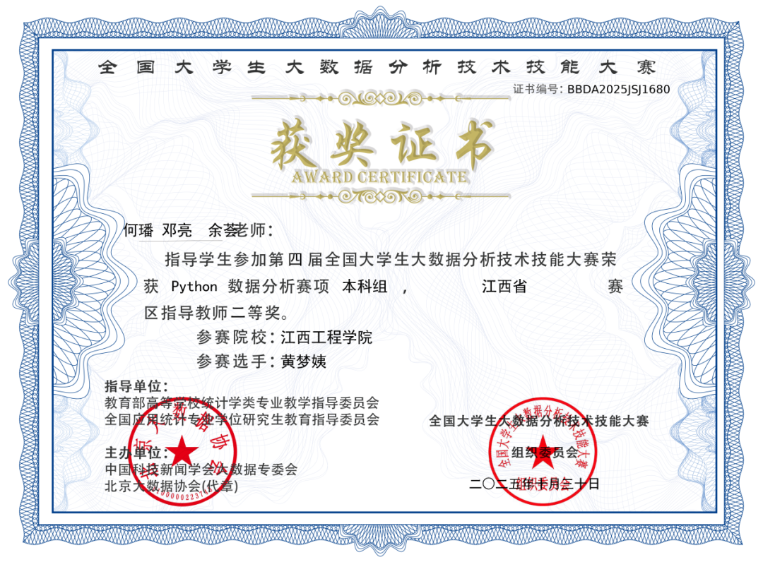 此次获奖是对学子们努力付出的肯定,更是学校“以赛促学、以赛促教”教育理念的生动体现。下一步,学校将继续搭建优质赛事平台,鼓励学生积极参与各类学科竞赛,锤炼专业技能,为培养更多高素质应用型大数据人才蓄力赋能。