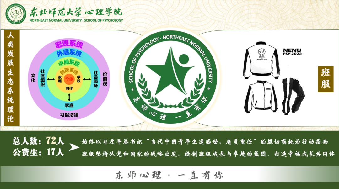 心理学院2023级心理班现有学生72人,班级自组建起,便以习近平总书记对青年的殷切嘱托为指引,以尤里・布朗芬布伦纳的“人类发展生态系统理论”为蓝图,构建“宏、外、微”系统协同的班级建设体系。
