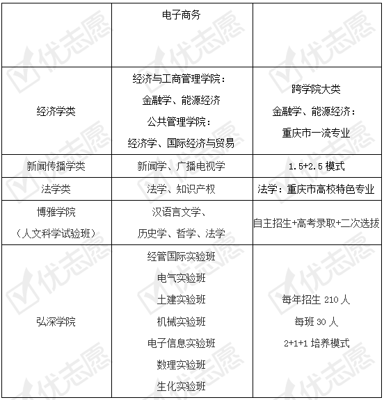 除中外合作学院外,重大还有博雅学院和弘深学院。博雅学院主要培养学生的人文/社会科学学科知识,含汉语言文学、历史学、哲学和法学四个专业。弘深学院主要培养高素质复合型创新人才,该学院现现设经管国际实验班等7个实验班,采用“2+1+1”的培养模式,前两年主修公共基础课程等,第三年主修专业课程等,第四年以跨学科实践项目为指导,选修相关课程等。
