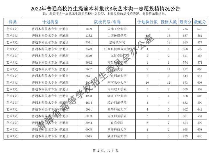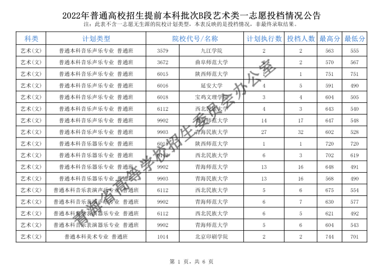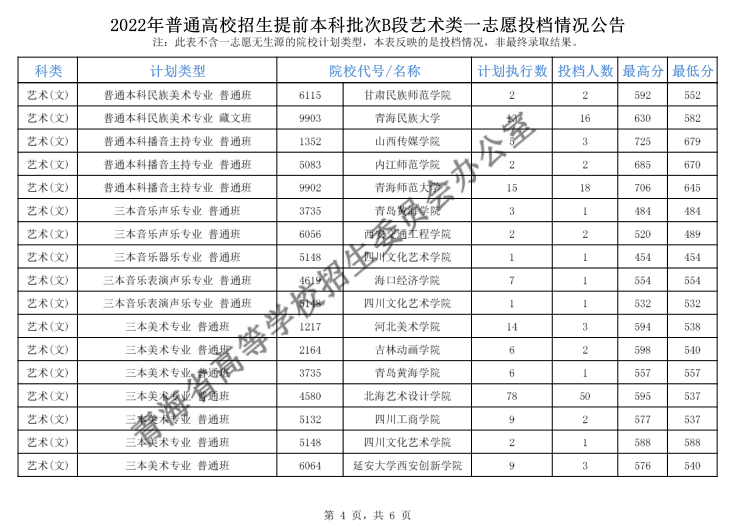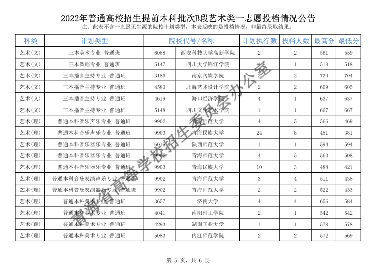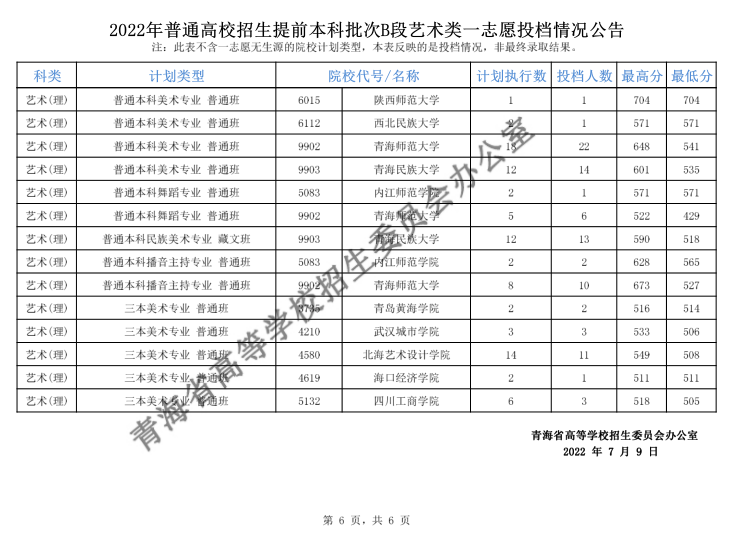 青海2022年普通高校招生提前本科批次B段艺术类一志愿投档情况公告