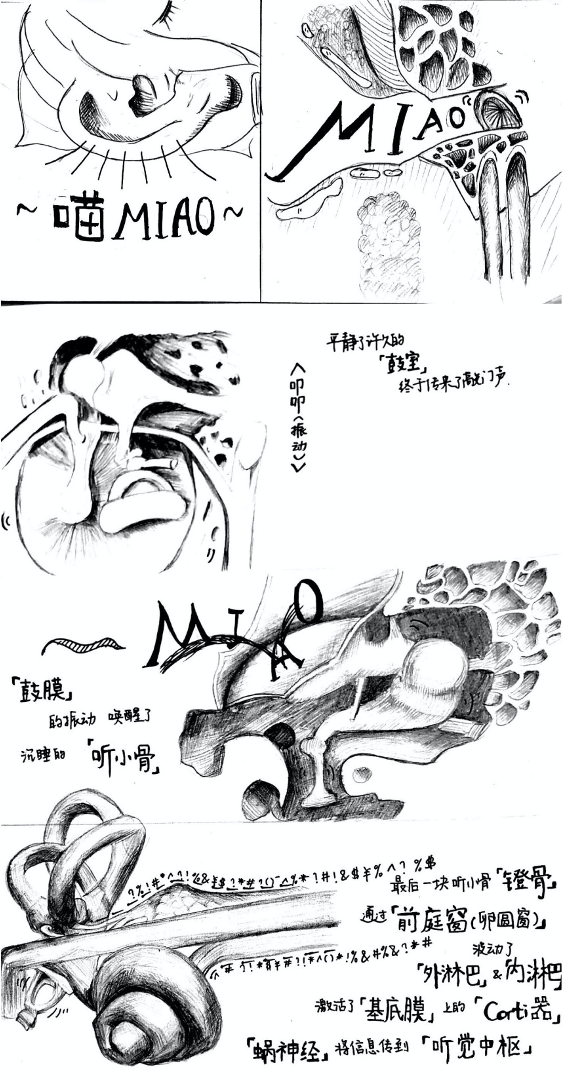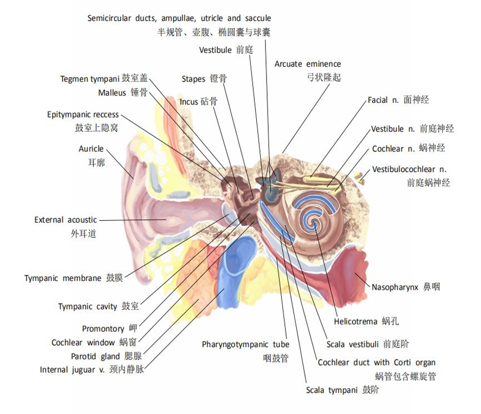 用清爽的配色清晰地描绘了耳廓、中耳和内耳的部分结构。