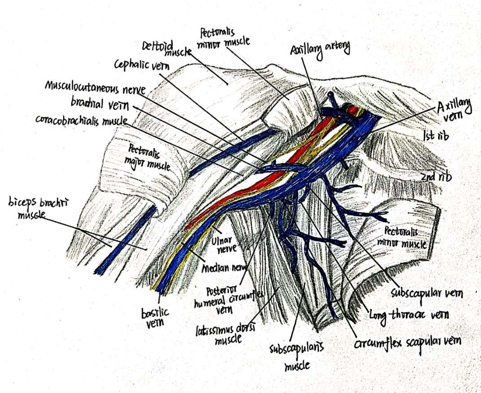 在血管神经束中腋静脉位于腋动脉的前内侧,在背阔肌下缘处由肱静脉延续而来,至第一肋骨外侧缘处向上续于锁骨下静脉。腋静脉是上肢静脉的主干,除收纳与腋动脉分支伴行的静脉外,主要接受头静脉和贵要静脉等浅静脉的汇入。