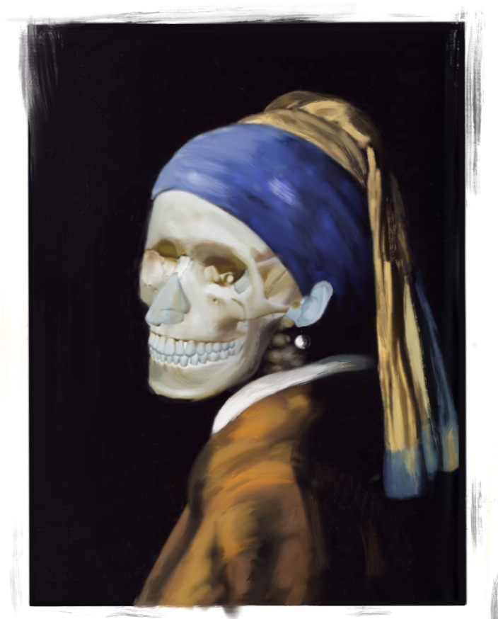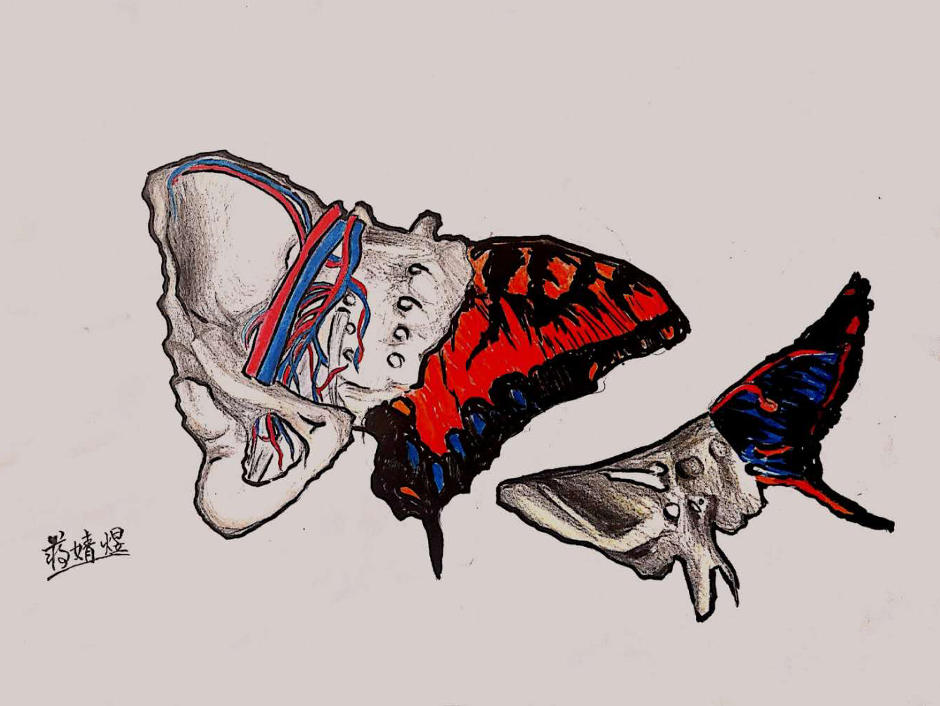 即使褪去了皮囊,也可见她淡雅恬静的气质,骷髅的骨感加上黄蓝的活泼,简简单单,对比鲜明,但又不违和,似乎她是黑夜里的明灯,微微的光彩,不夺目不耀眼,十分温和。