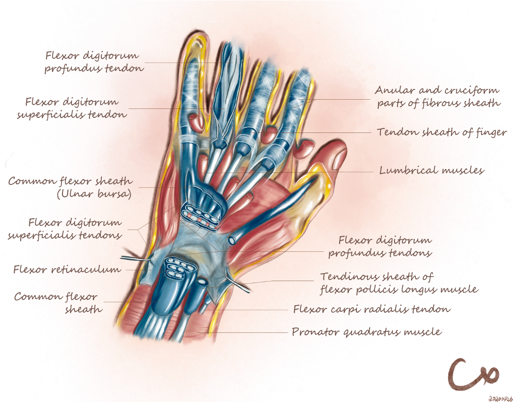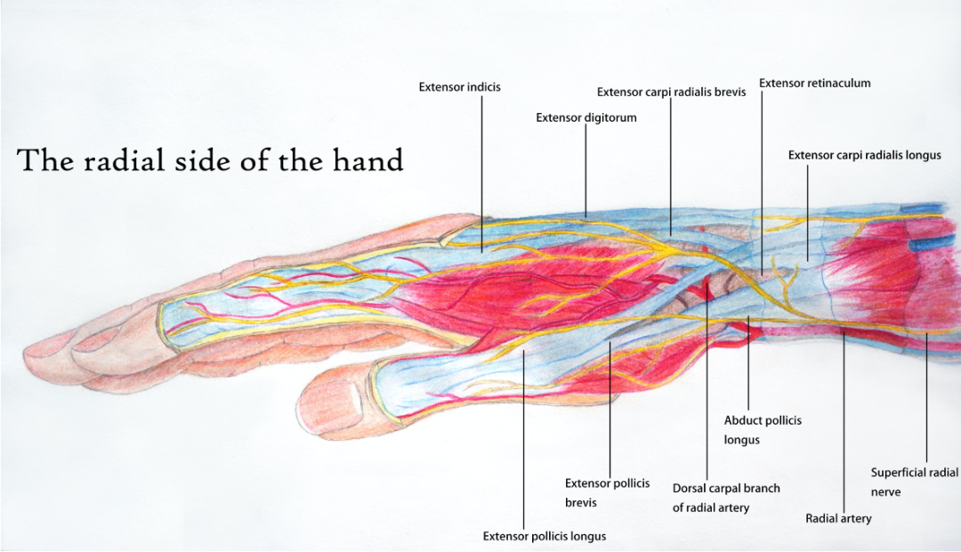 描绘手部桡侧的皮肤、肌肉、血管、神经的分布。