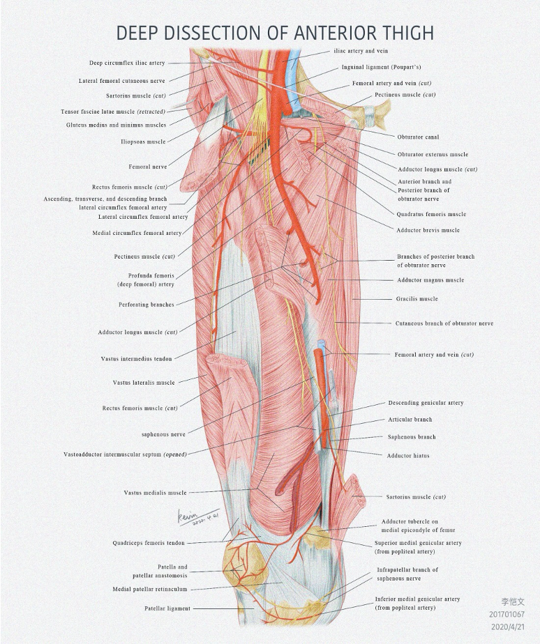 以线条的形式表现大腿前侧深层解剖结构,较为清晰地展现血管、肌肉、神经等的毗邻关系。
