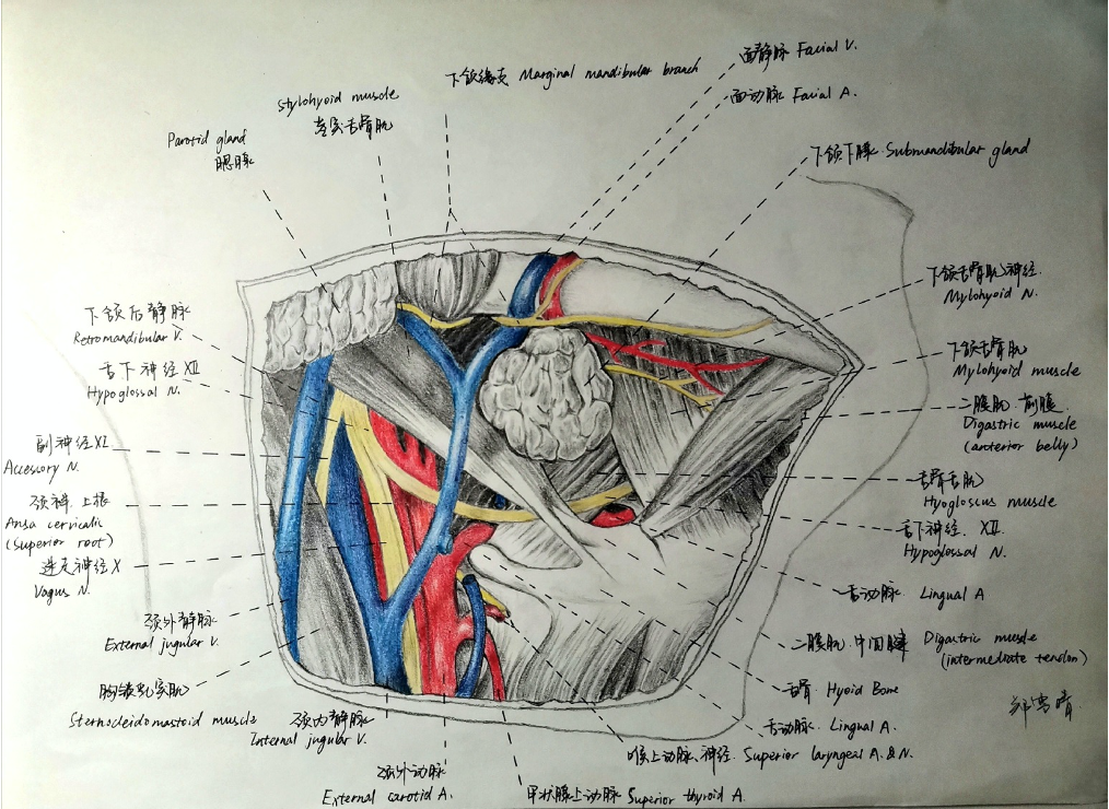 一根中华铅笔、一根红蓝铅笔、一根土黄色彩铅,即可清晰勾勒出下颌下三角的层层结构。