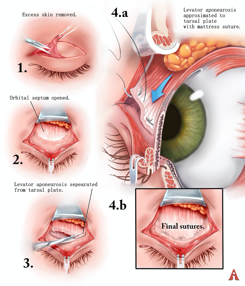 示眼睑成形术和上睑提肌切除术主要步骤。