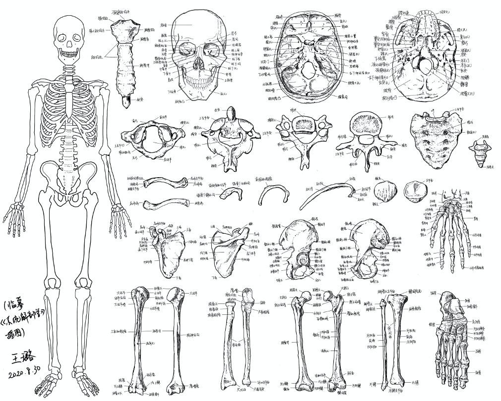 将人体绝大部分骨骼的形态整理在一幅图中,并加以图注,能够体会到清晰、整齐的人体之美,同时方便对骨骼系统的复习。