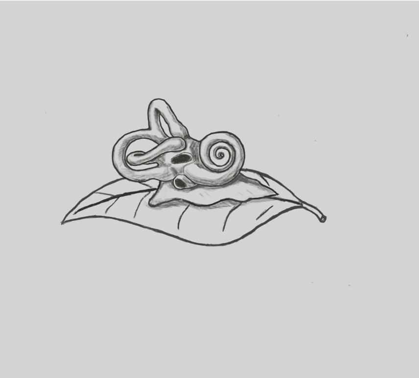 以耳蜗结构为基础,加以一定的艺术创作画成在树叶上爬行的蜗牛。耳蜗的名称来源于其结构与蜗牛壳的相似性,英文cochlea即为