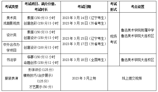 (一)“美术类”、“戏剧影视类”、“设计类”、“中外合作办学项目”初选通过的考生,可根据个人意愿及考点容量安排,选择在鲁迅美术学院附属中学或鲁迅美术学院大连校区进行现场考试;