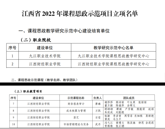 日前,江西省教育厅公布了 2022 年江西省课程思政示范项目名单,江西财经职业学院党委书记刘彪文教授主持的“江西财经职业学院课程思政教学研究中心”被确定为课程思政教学研究中心示范项目,《财务报表审计》《成本核算与管理》《茶艺》《市场营销理论与实务》等4门课程被认定为课程思政示范课程(教学名师、教学团队),所获成果数量在省内同类院校中位居前列。